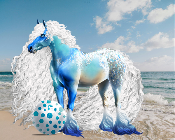 Avifors with Tangaroa! Beautiful work with the splashing water and blues on the lovely sandy colors! Complete even with fun summertime bubbles, shells, kelp and more, this horse is an excellent beach snapshot!