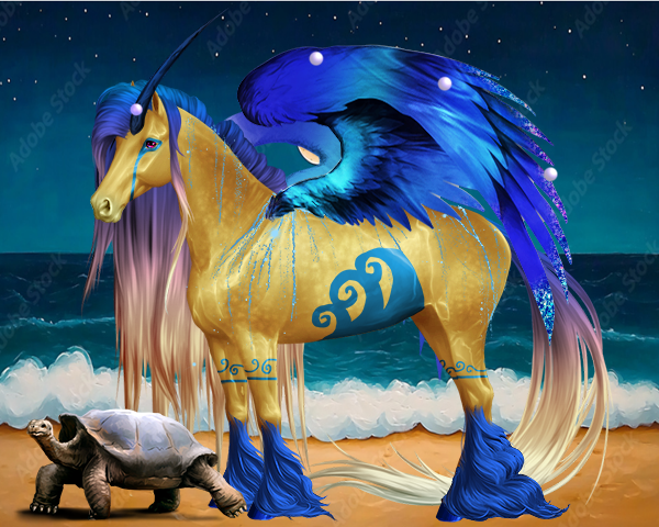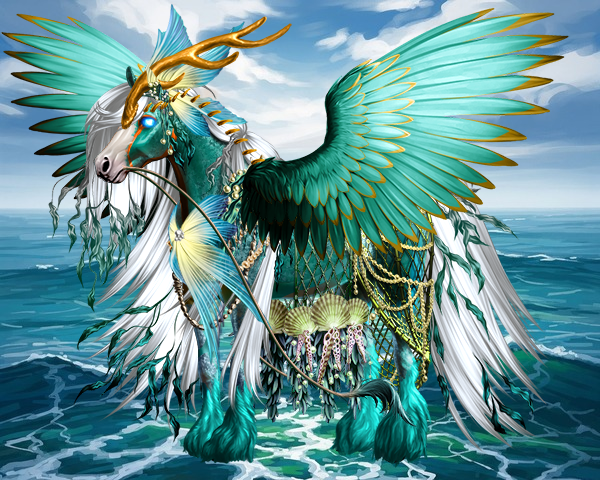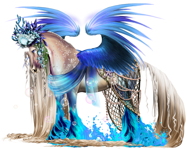 Avifors with Tangaroa! Beautiful work with the splashing water and blues on the lovely sandy colors! Complete even with fun summertime bubbles, shells, kelp and more, this horse is an excellent beach snapshot!