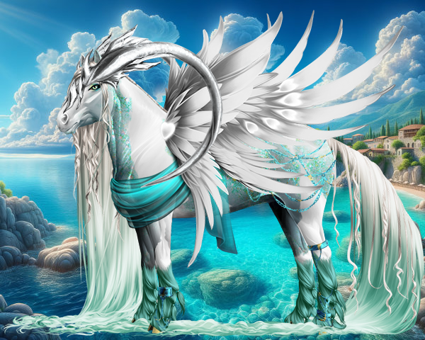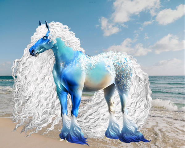 Northstar and Ocean Breeze! You can practically feel the warm beach breeze through the billowing hair, the sand shimmering through the crystal blue waters. This horse contains the entire beach -- on itself! Gorgeous!